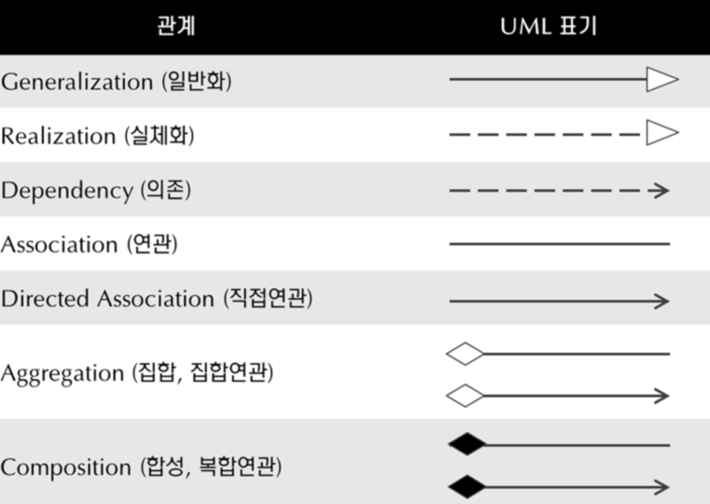 여러 개체를 하나의 그룹으로 묶는 관계. 객체 간의 구성이나 집합 관계를 나타내지만 소프트웨어 디자인에서는 자주 사용되진 않음.